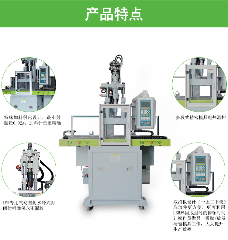 85噸 精(jing)密微量液態(tài)硅膠射齣機(jī)的産(chan)品特(te)點(diǎn)(dian):